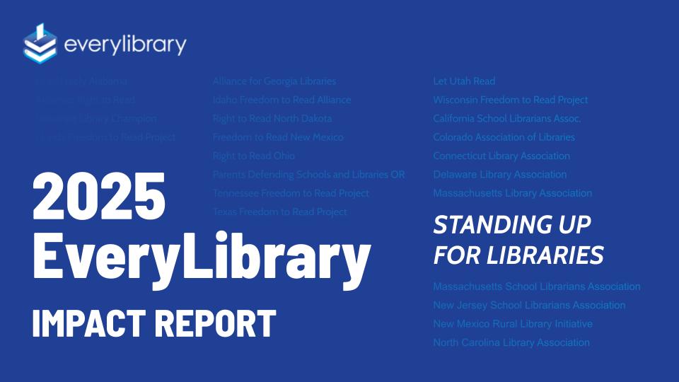 EveryLibrary. Read the 2025 EveryLibrary Impact Report. Published January 14, 2026 on EveryLibrary.org. Texto completo El 2025 EveryLibrary Impact Report documenta las actividades y logros de EveryLibrary, una organización nacional (501(c)(4)) dedicada a defender las bibliotecas, la libertad de lectura y el acceso a la información en Estados Unidos, durante el año 2025. En un…